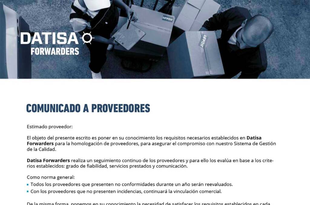 En este documento se detallan los requisitos de homologación de proveedores de Datisa Forwarders, así como los criterios de evaluación continua basados en calidad, fiabilidad, servicio y cumplimiento de plazos. También se solicita la aportación de certificaciones de calidad, medio ambiente y seguridad para la evaluación y seguimiento de proveedores.