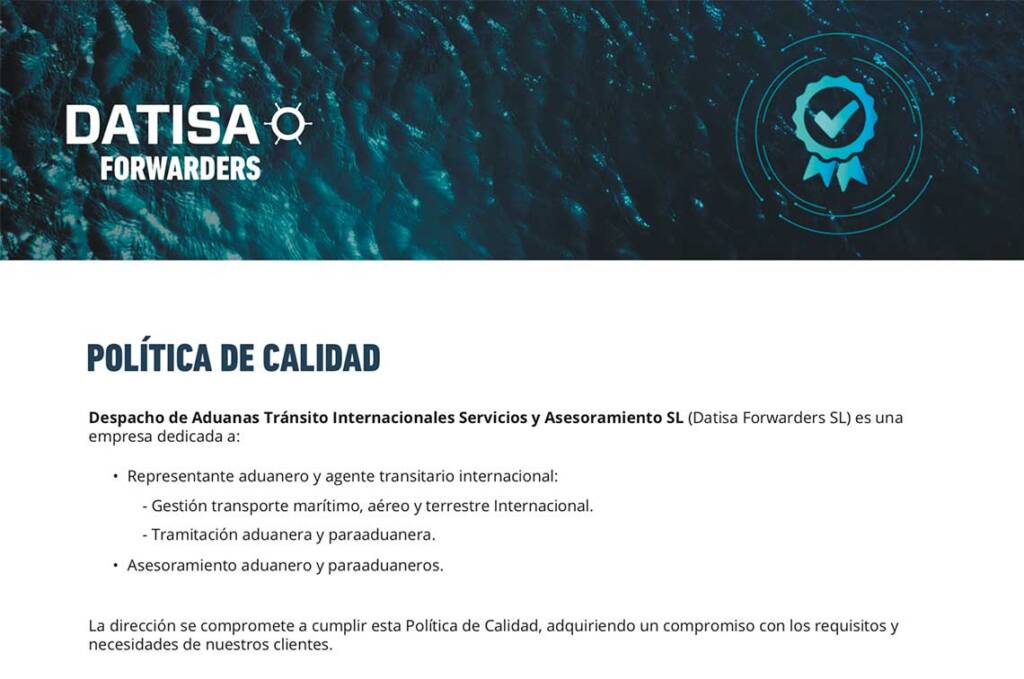 La Política de Calidad de Datisa Forwarders define su compromiso con la excelencia en los servicios de representación aduanera y transporte internacional, el cumplimiento de la norma ISO 9001, la satisfacción del cliente, la mejora continua, la formación del personal y el control de proveedores, garantizando calidad, seguridad y competitividad.